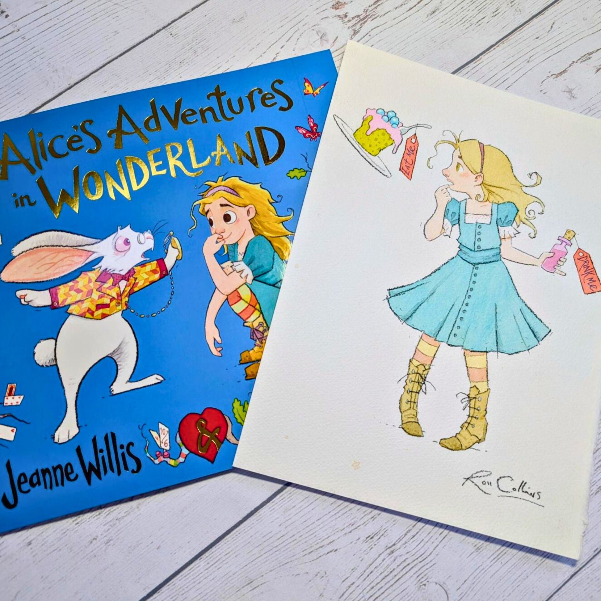 Item details: Colour study of Alice by Ross Collins. Early work for Ross' version of Alice's Adventures in Wonderland, published by Macmillan 2021. Watercolour and charcoal on watercolour paper. A4 size.