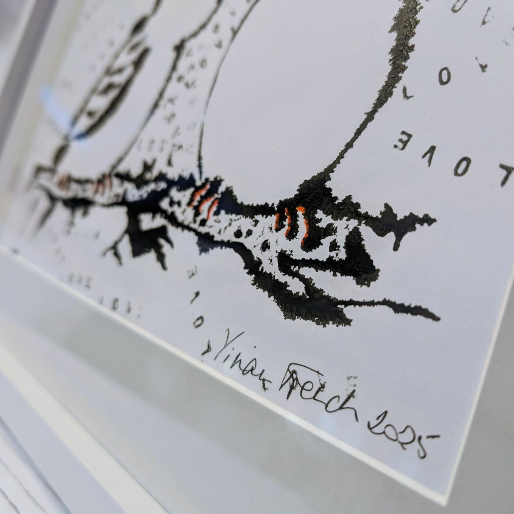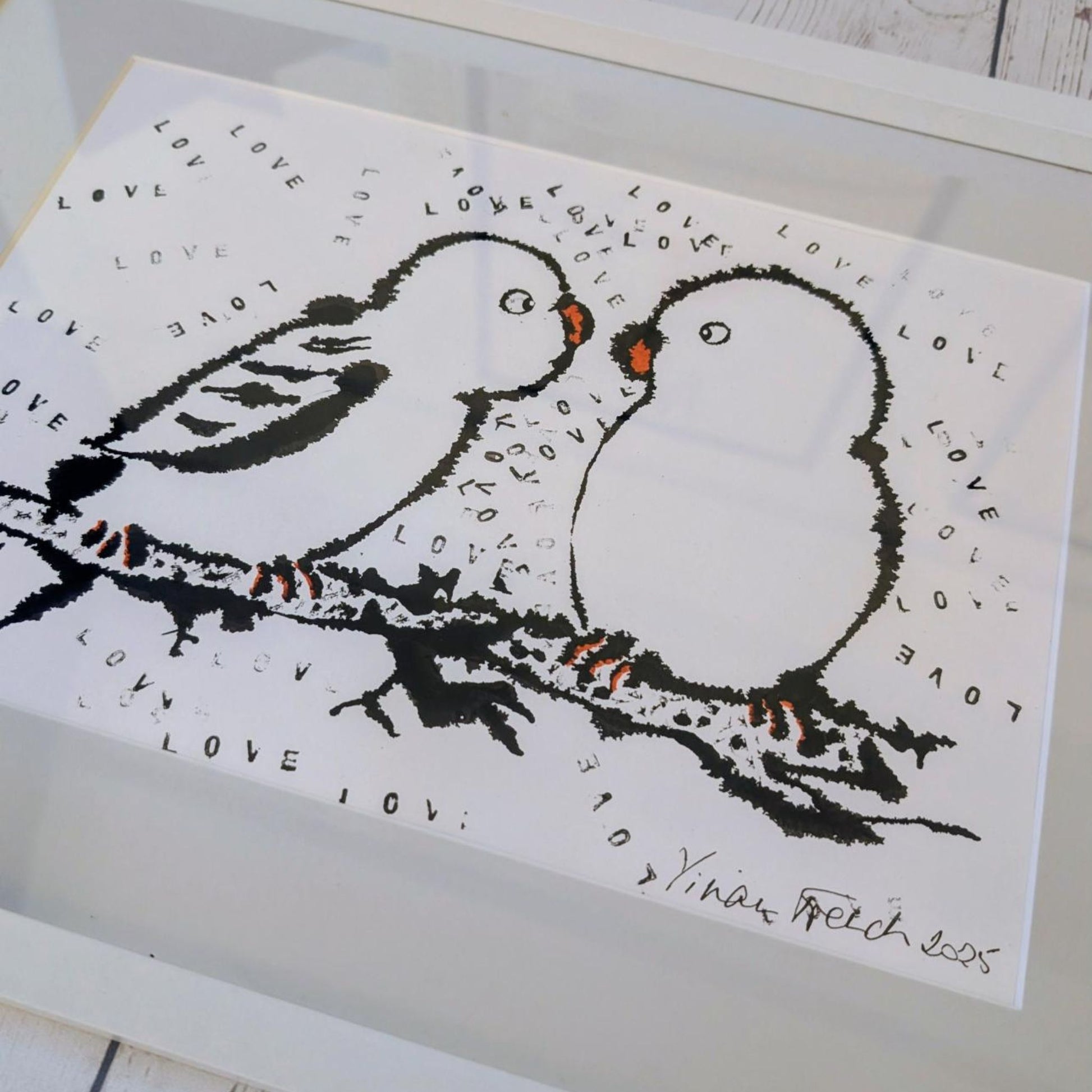 Viv French is an Edinburgh-based artist and author, first published in 1990 and creating brilliant new work to date. She is the writer of over three hundred children’s books, including Oliver’s Vegetables (1995), Jodie the Juggler (2005), The Most Wonderful Thing in the World (2015) and We’re Getting a Cat (2018). For our auction, Vivian has donated an illustration of two birds on a branch, surrounded by the refrain ‘love, love, love.’