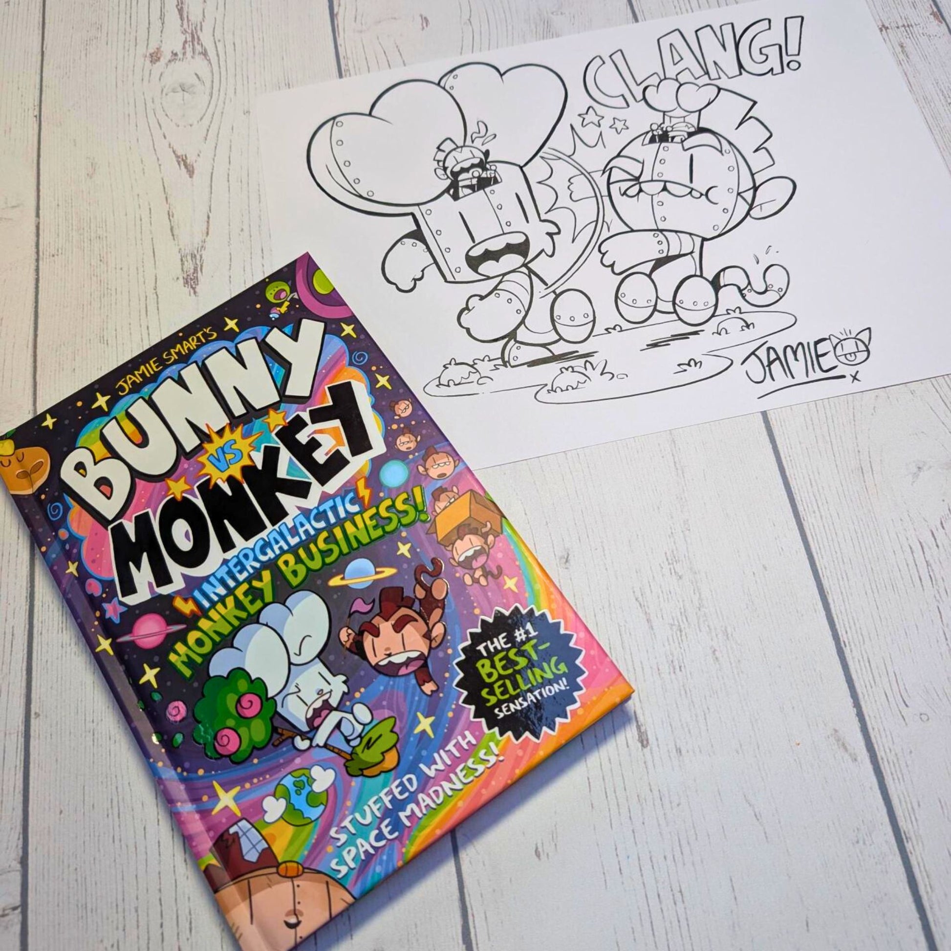 Jamie Smart is an award-winning, best-selling comic artist and author known for his comic series Bunny vs Monkey, Looshkin, Max and Chaffy and Megalomaniacs, which launches in in 2025. Jamie also took part in one of our most popular Authors Live with the BBC episodes. For our auction, Jamie has donated an original illustration of the iconic Bunny and Monkey from his long running weekly strip, Bunny vs Monkey, which is published in The Phoenix and has been collected into an ongoing series of best-selling books. The latest collection, Bunny vs Monkey: Intergalactic Monkey Business (2025) was released in October. The illustration features Monkey driving a giant robot Bunny, taking a swing at Bunny riding a giant robot Monkey.