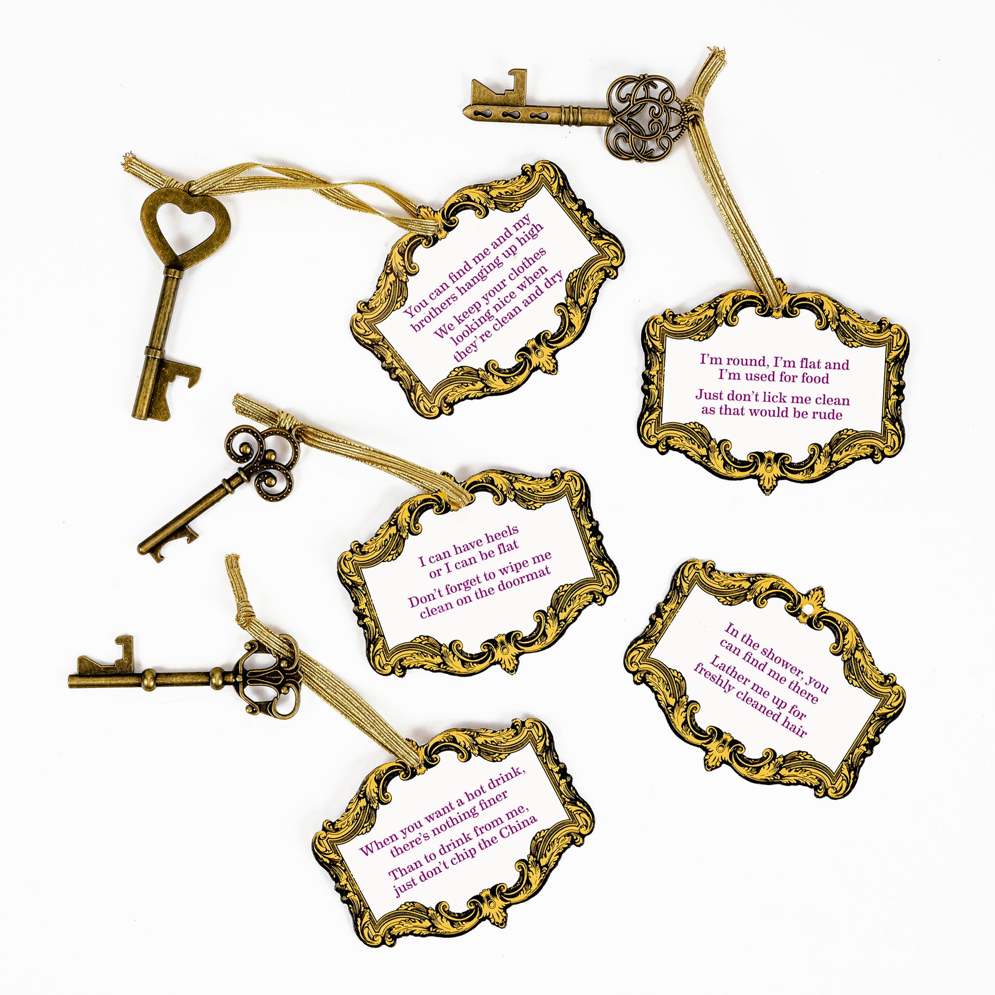 - Contents: 8 metal keys, 40 riddles, gold ribboand instructions