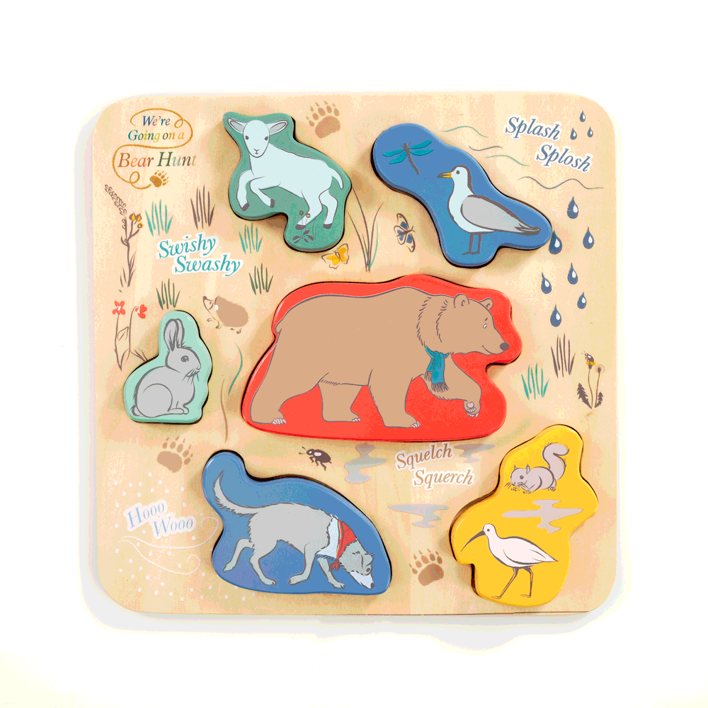 Little ones can have their own adventure with this fun and colourful We're Going on a Bear Hunt wooden shape puzzle.