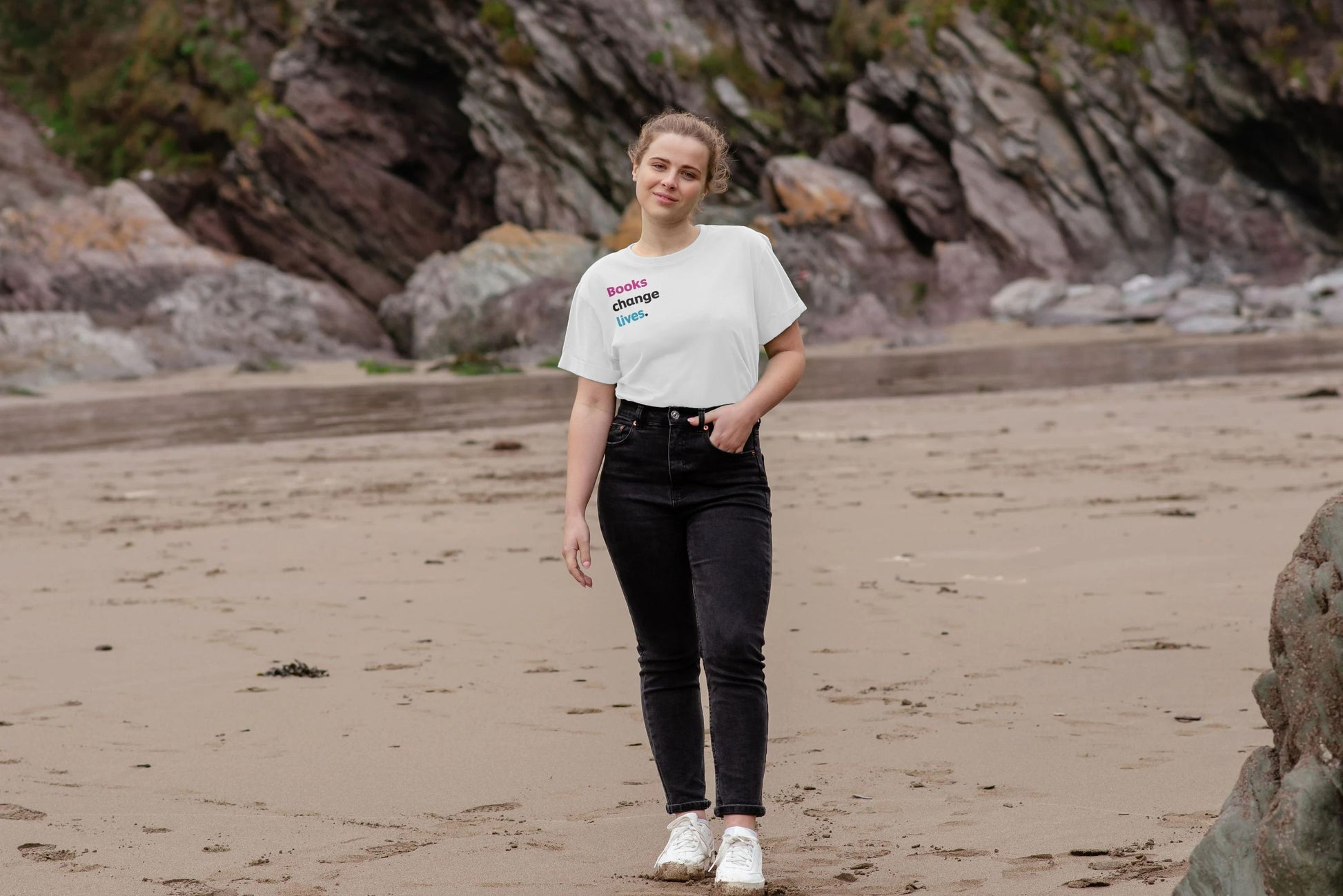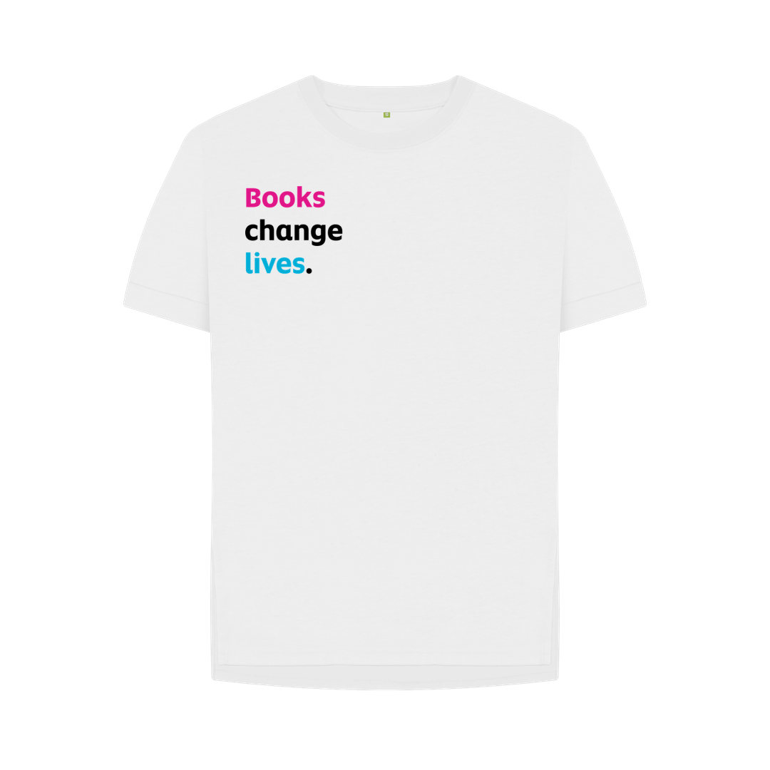 100% organic t-shirt featuring the slogan 'Books change lives' on the right hand side.