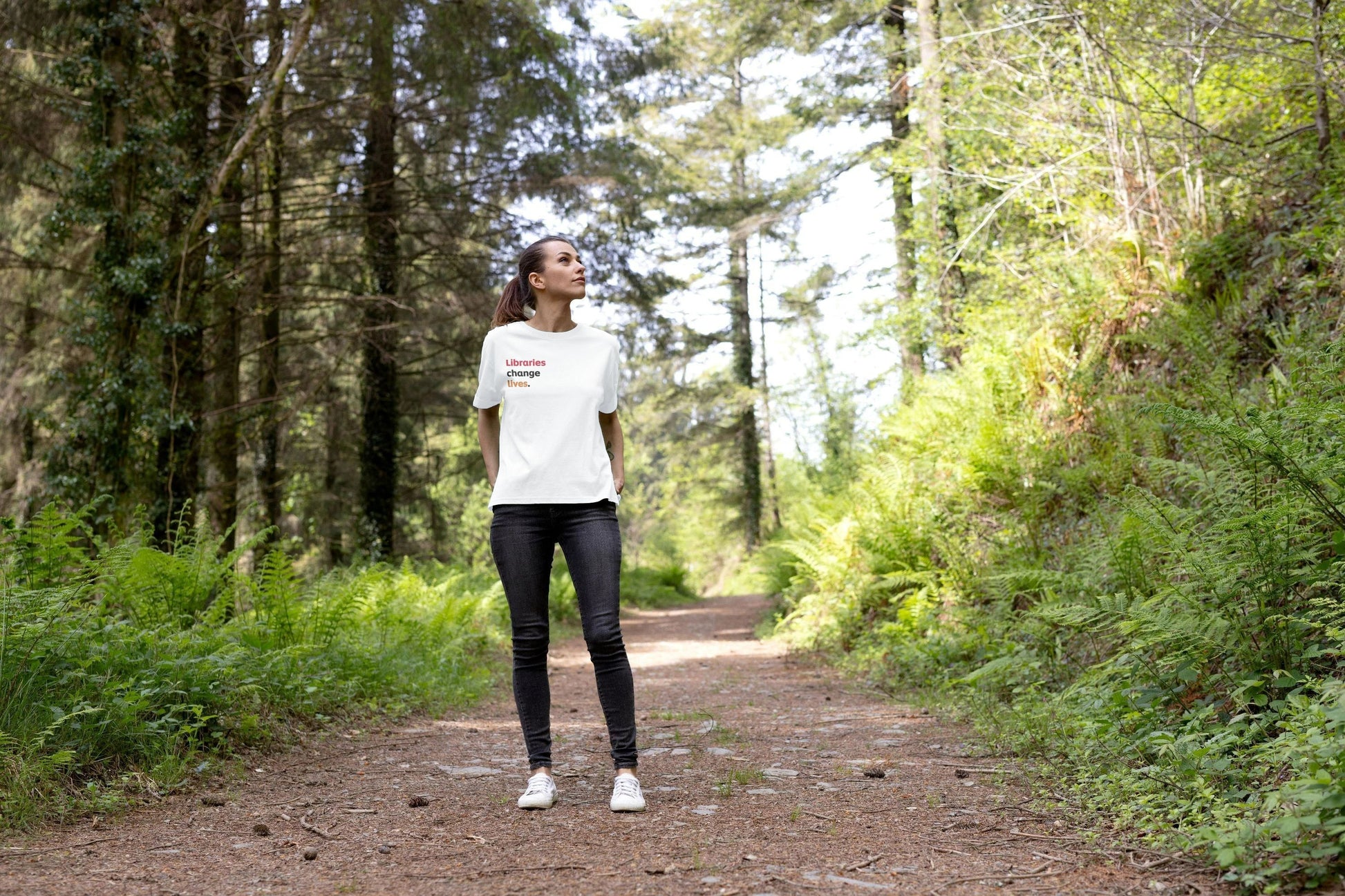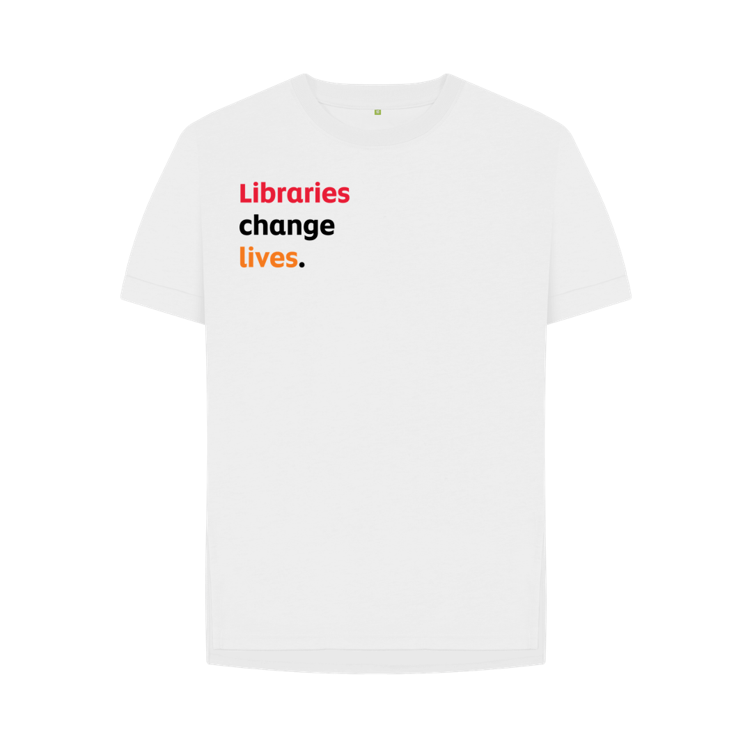 100% organic t-shirt featuring the slogan 'Libraries change lives' on the right hand side.